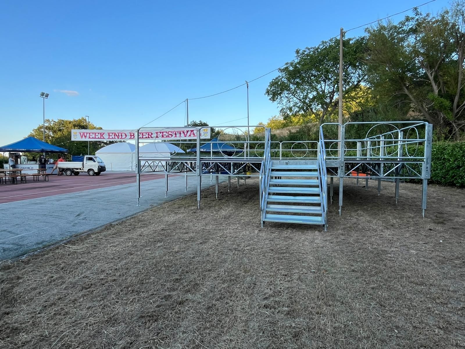 Proponiamo un ampio catalogo di forniture per eventi: palchi modulari professionali (fino a 12x10 metri), transenne in plastica o antipanico per la sicurezza del pubblico, gruppi elettrogeni per garantire l'autonomia energetica, e tavoli e panche per accogliere ospiti e staff con praticità. Ogni elemento viene trasportato e montato con attenzione, rispettando tempi, spazi e standard di sicurezza.
